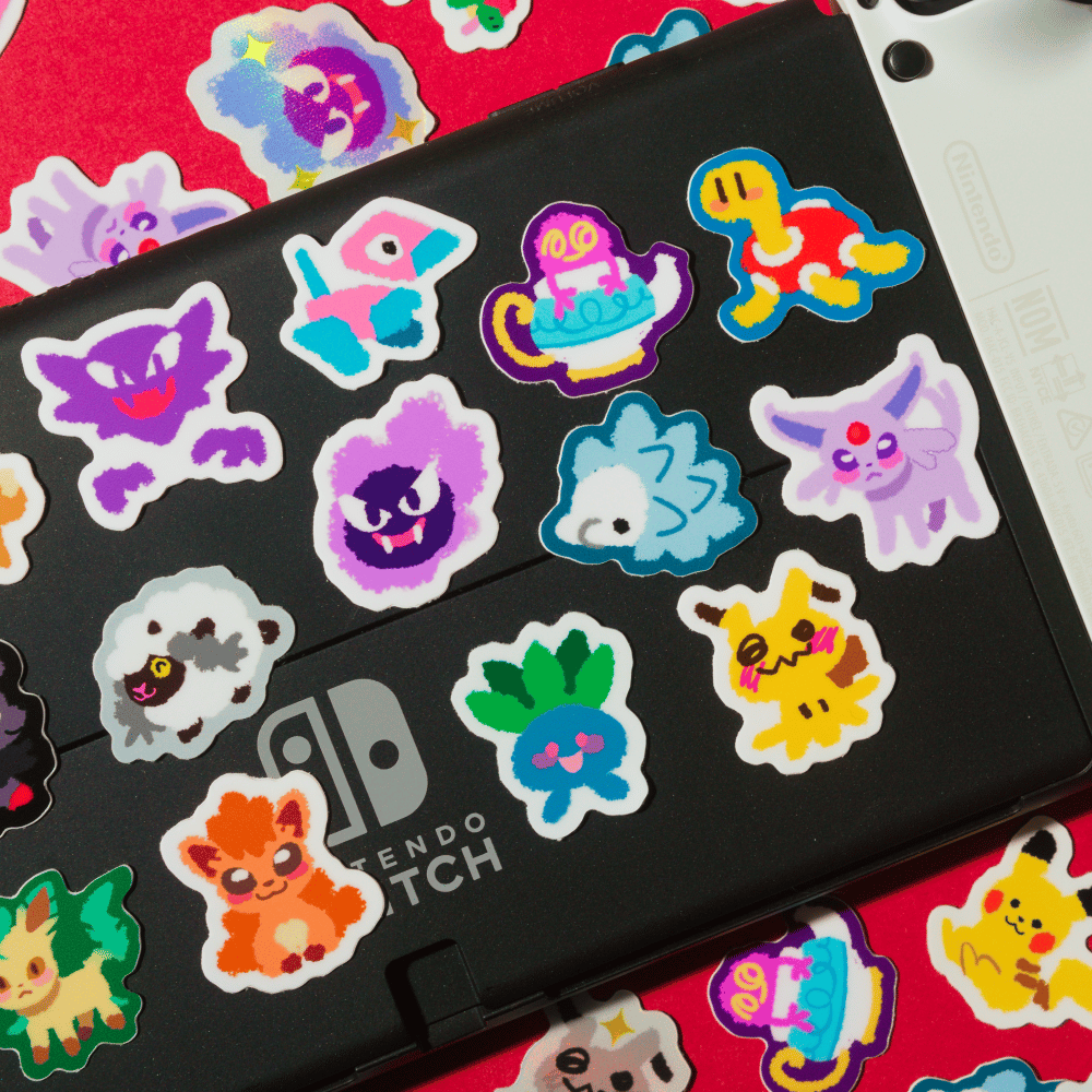 1.5 inch matte vinyl stickers. You will receive SIX RANDOM stickers with a chance to receive a shiny version. You will not receive duplicates. Shiny versions will have gold foil.